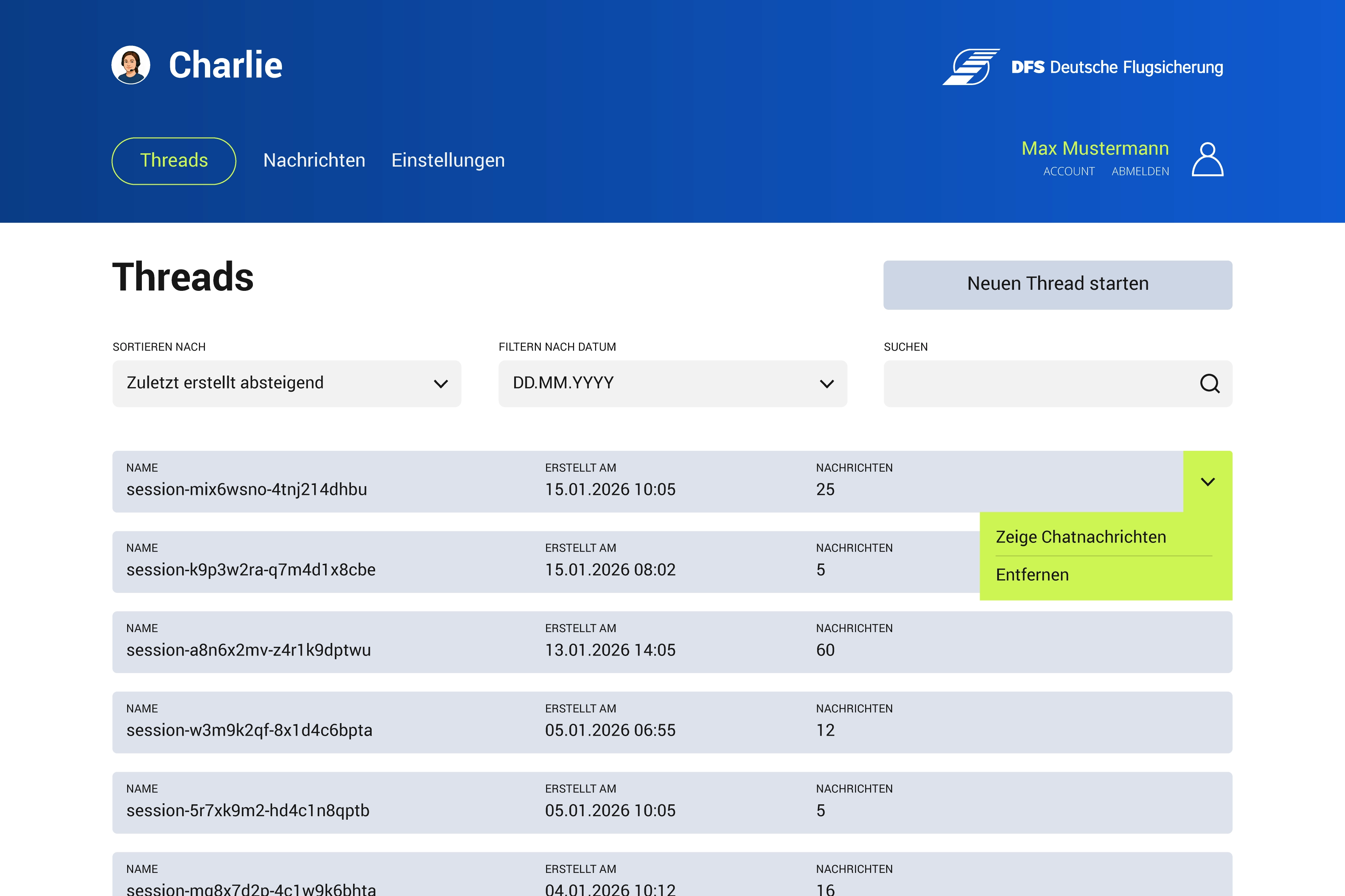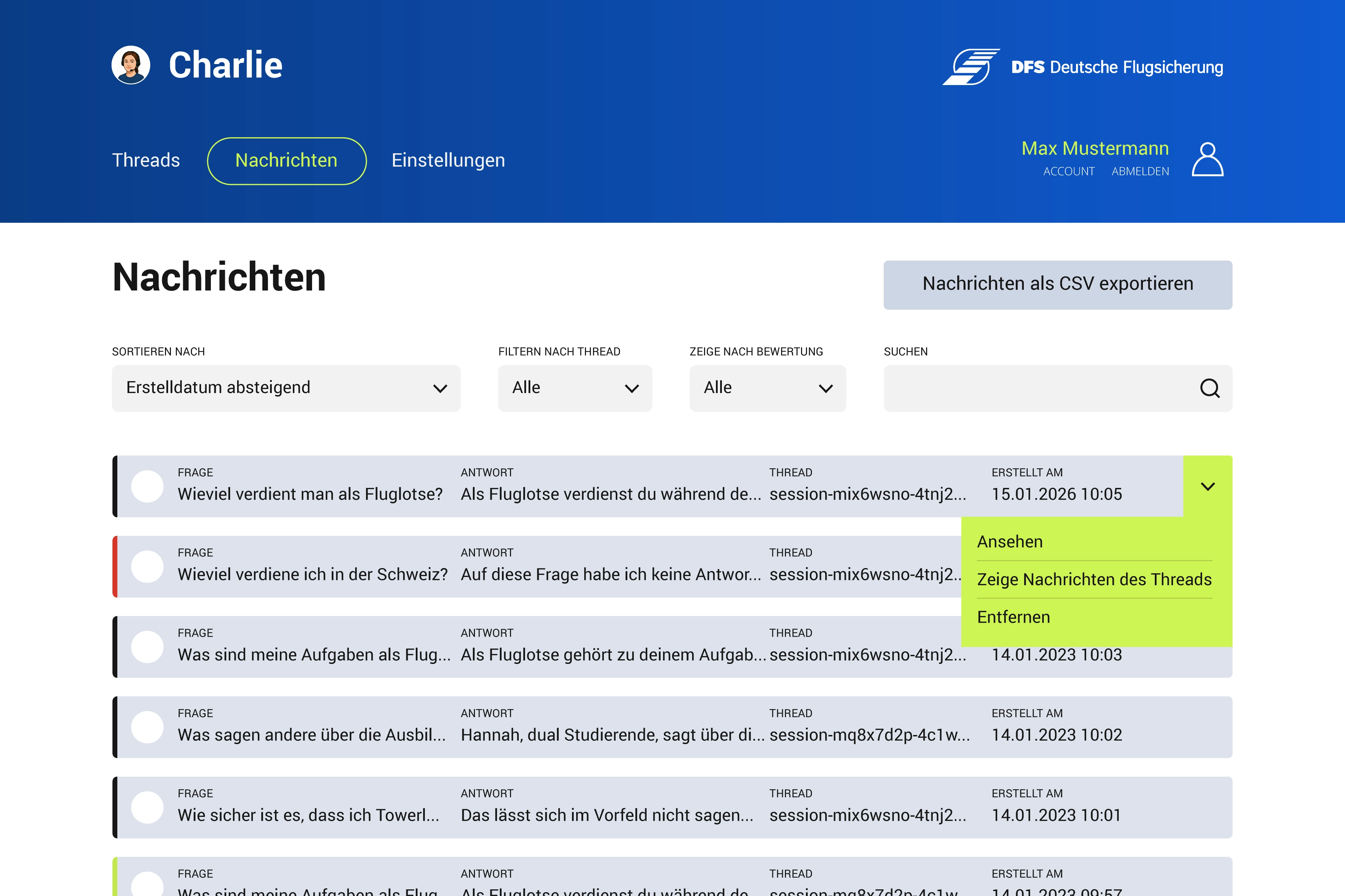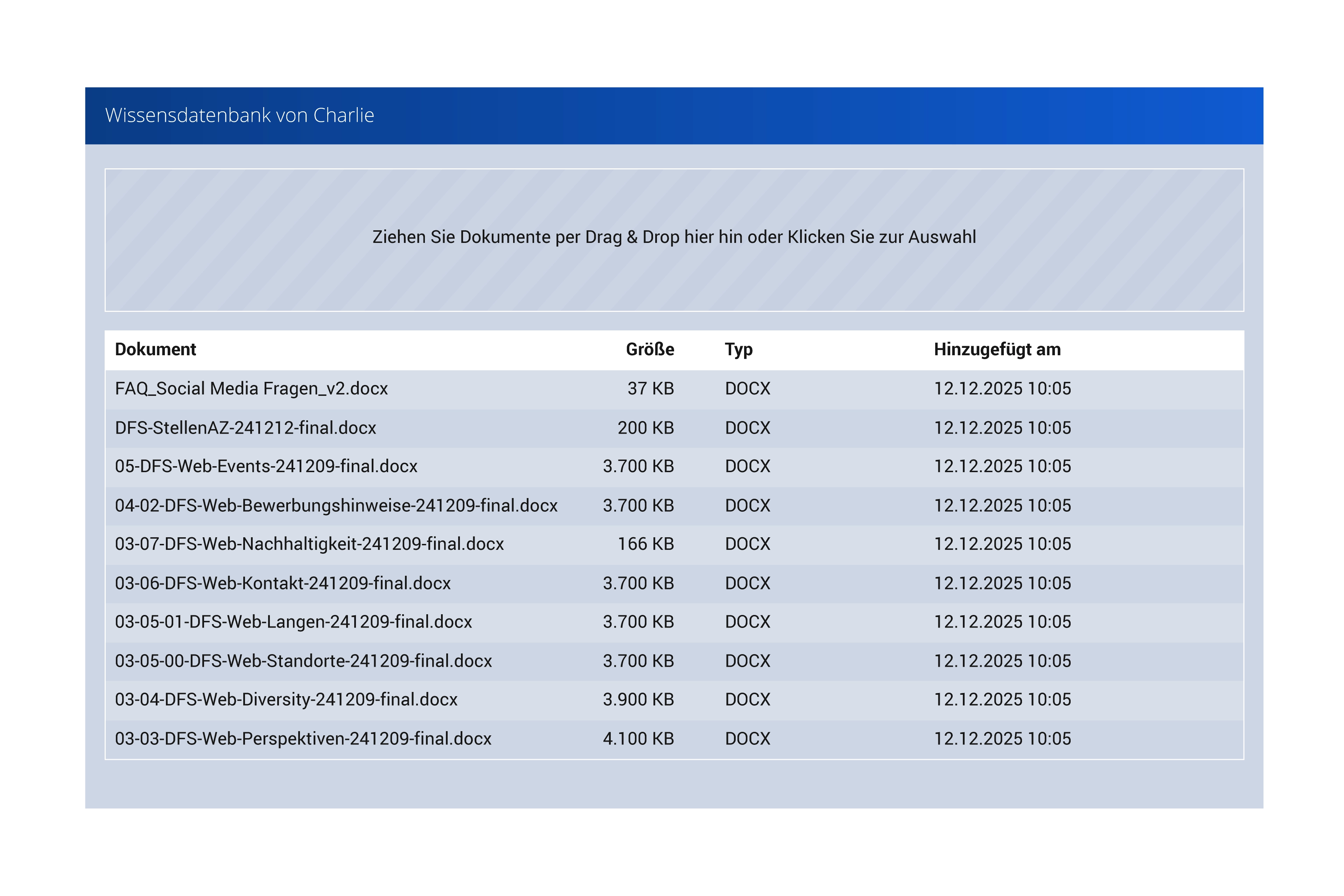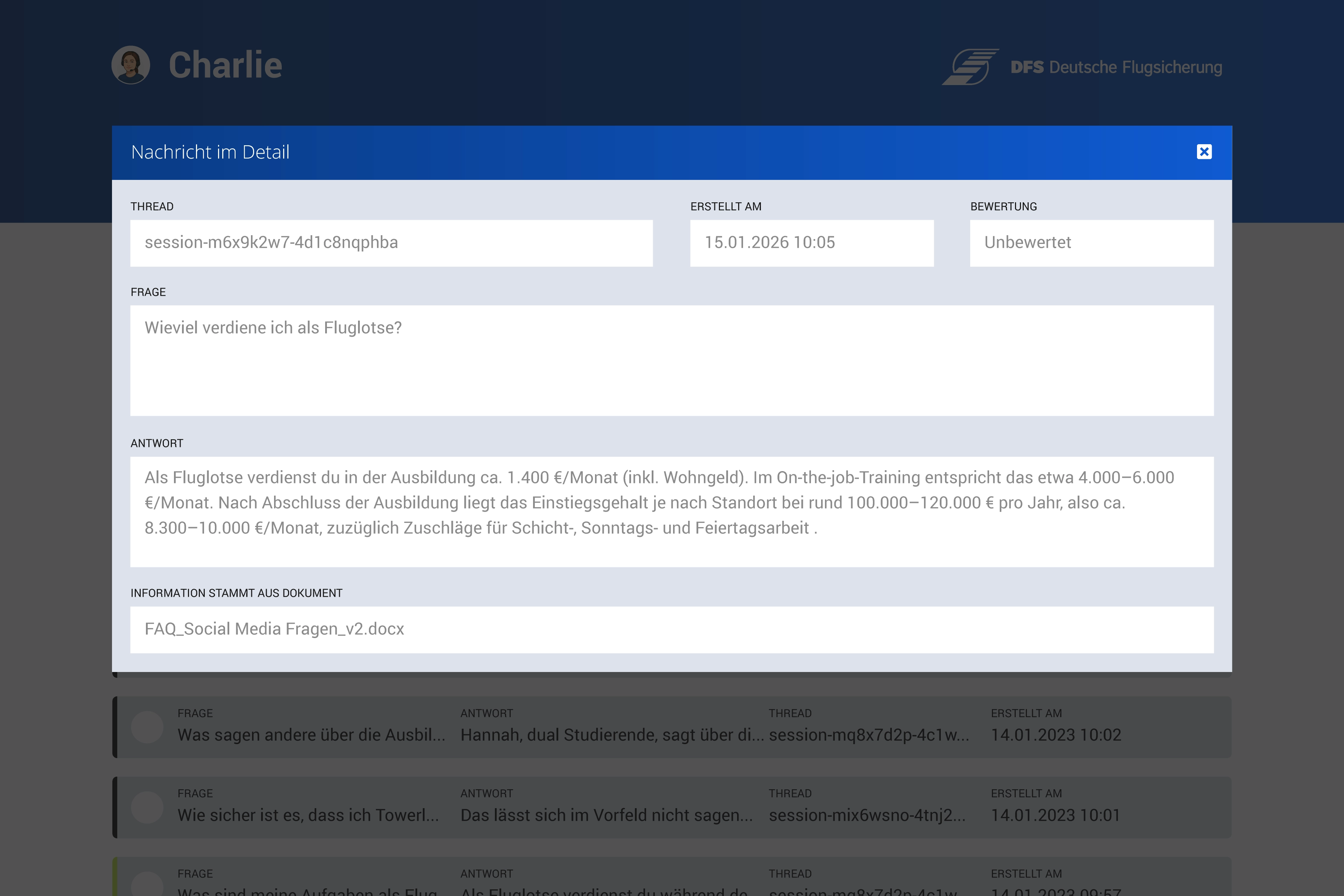Das Chatbot Backend ist ein Tool zur Verwaltung eines Chatbots. Es ermöglicht die Verwaltung von Threads (Nachrichtenverläufe) und der darin enthaltenen Nachrichten. Darüber hinaus können Dokumente des Vektorspeichers verwaltet werden. Das Tool ist in PHP und Vanilla JavaScript implementiert und nutzt die Azure OpenAI API zur Fernsteuerung des RAG-Systems in Azure.